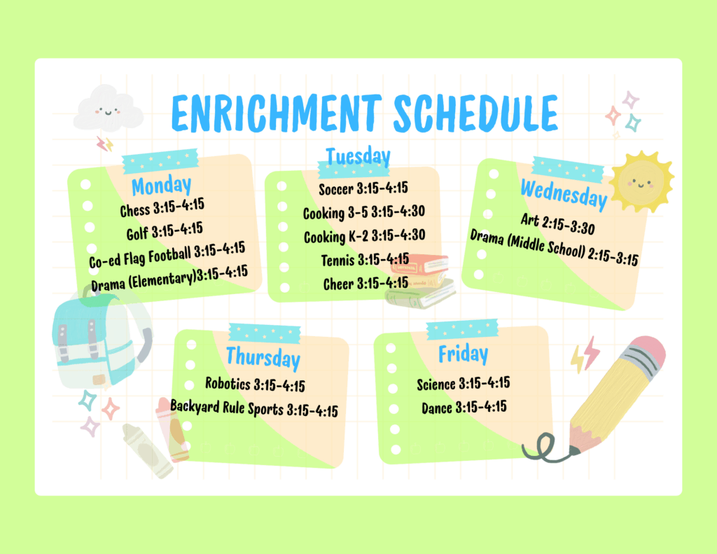 This annual fee helps the school offset the costs of the program; managing operations, supervising students during enrichment hours, providing emergency care when necessary, and covering liability costs associated with having students on campus after school hours.