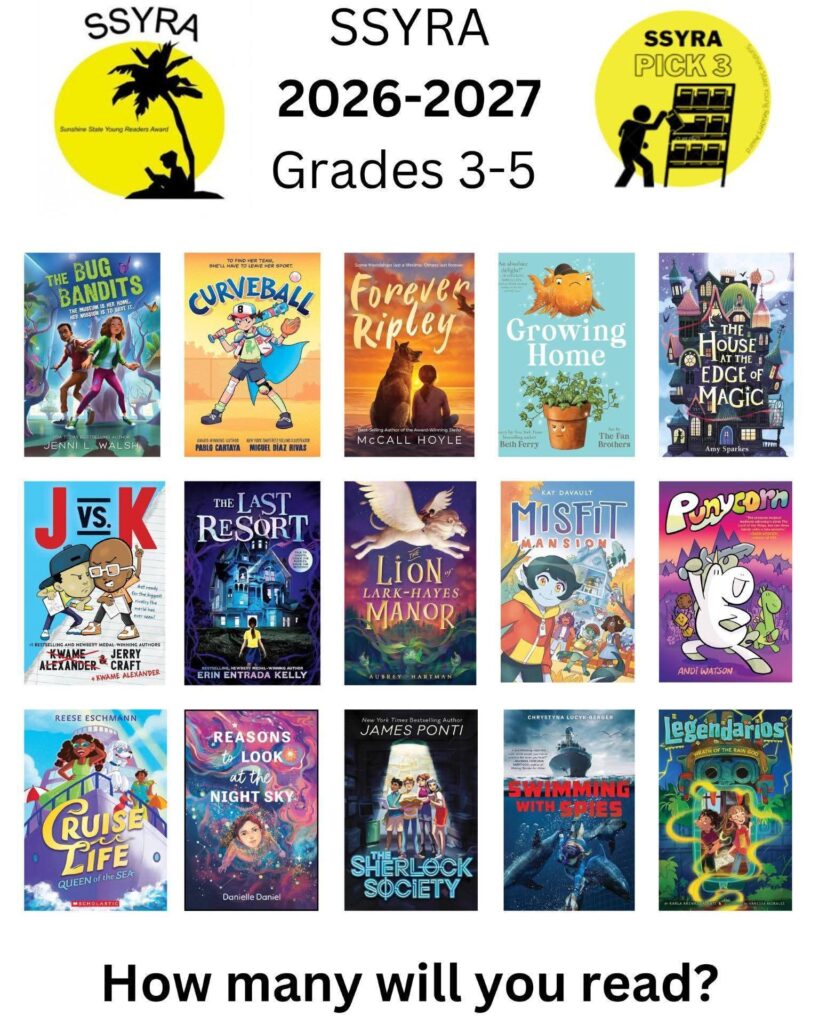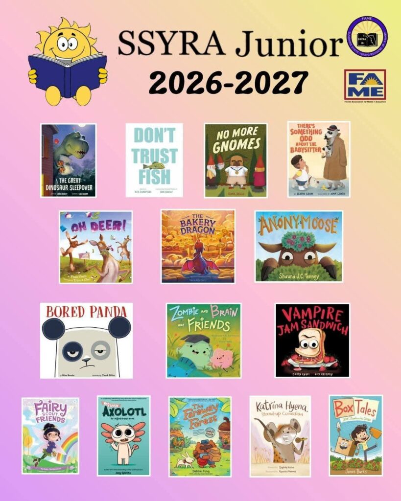 The Sunshine State Young Readers Award (SSYRA) Program is a statewide reading motivational program for students in grades K through 8. The purpose of the SSYRA Program is to encourage students to read independently for pleasure and to read books that are on, above, and below their reading level in order to improve their reading fluency. Sunshine State books are selected for their wide appeal, literary value, varied genres, curriculum connections, and/or multicultural representation. The SSYRA committee is comprised of members of FAME (Florida Association for Media in Education) who are qualified school librarians located throughout the state of Florida, subdivided into three committees: SSYRA Jr (K-2), SSYRA (3-5), and SSYRA(6-8).